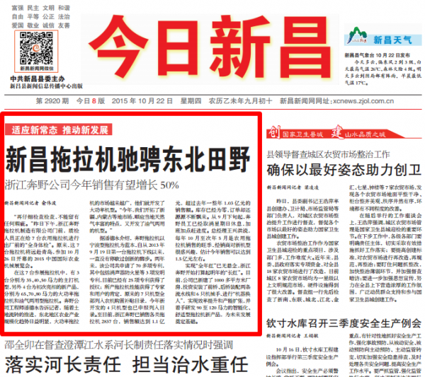 新昌新聞網(wǎng)記者 俞偉波 “再仔細檢查檢查,不能留有任何瑕疵。”昨日下午,浙江奔野拖拉機制造有限公司門前,質(zhì)檢人員正在給7臺農(nóng)用拖拉機進行出廠前的“全身體檢”。原來,這7臺拖拉機將遠赴青島,參加10月26日開幕的2015中國國際農(nóng)業(yè)機械展覽會。