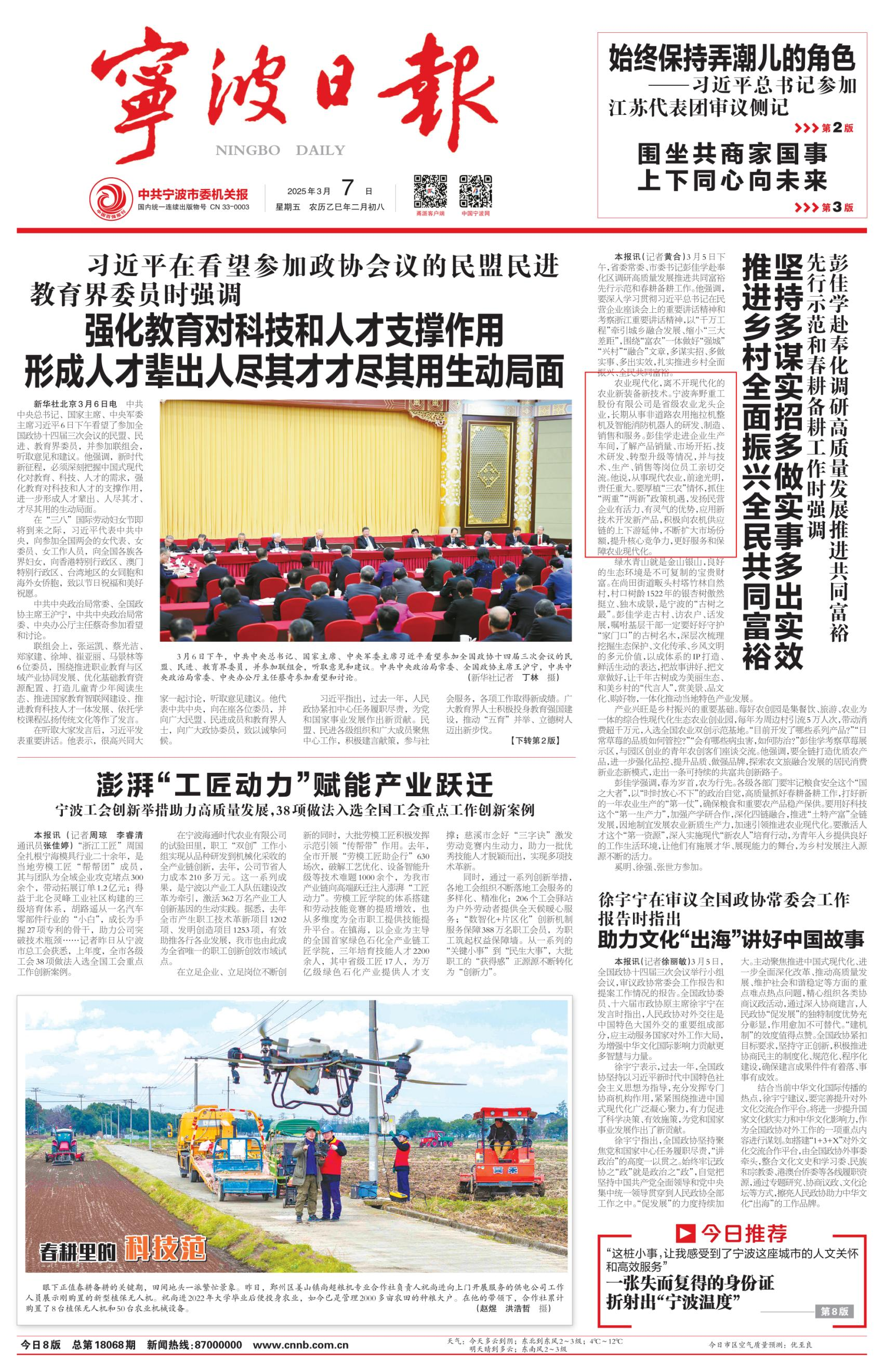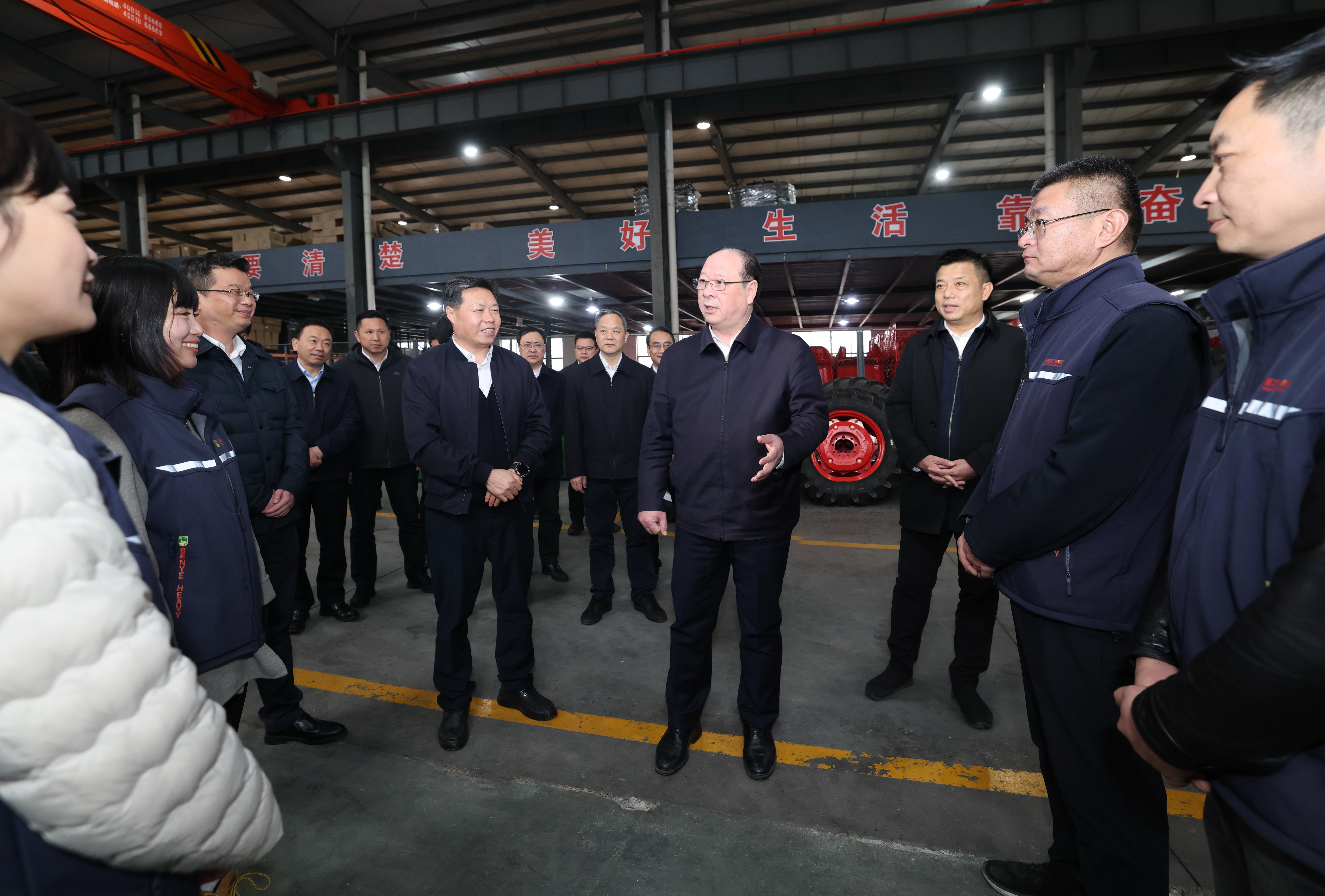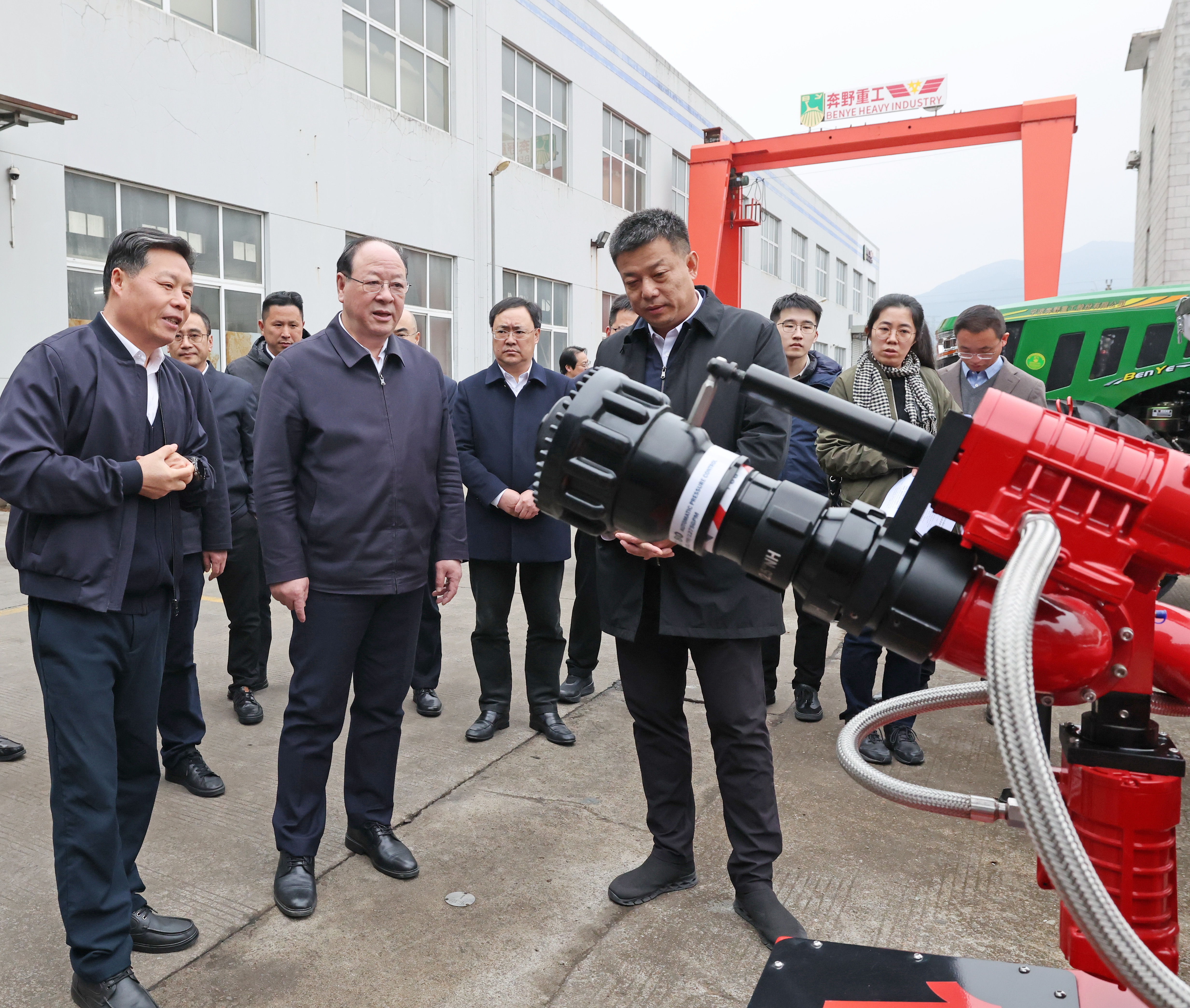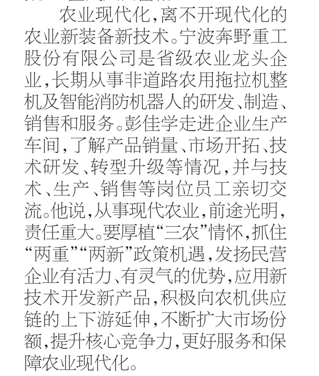 “農(nóng)業(yè)現(xiàn)代化,離不開現(xiàn)代化的農(nóng)業(yè)新裝備新技術(shù)。寧波奔野重工股份有限公司是省級農(nóng)業(yè)龍頭企業(yè),長期從事非道路農(nóng)用拖拉機整機及智能消防機器人的研發(fā)、制造、銷售和服務(wù)。彭佳學(xué)走進企業(yè)生產(chǎn)車間,了解產(chǎn)品銷量、市場開拓、技術(shù)研發(fā)、轉(zhuǎn)型升級等情況,并與技術(shù)、生產(chǎn)、銷售等崗位員工親切交流。他說,從事現(xiàn)代農(nóng)業(yè),前途光明,責(zé)任重大。要厚植“三農(nóng)”情懷,抓住“兩重”“兩新”政策機遇,發(fā)揚民營企業(yè)有活力、有靈氣的優(yōu)勢,應(yīng)用新技術(shù)開發(fā)新產(chǎn)品,積極向農(nóng)機供應(yīng)鏈的上下游延伸,不斷擴大市場份額,提升核心競爭力,更好服務(wù)和保障農(nóng)業(yè)現(xiàn)代化。”